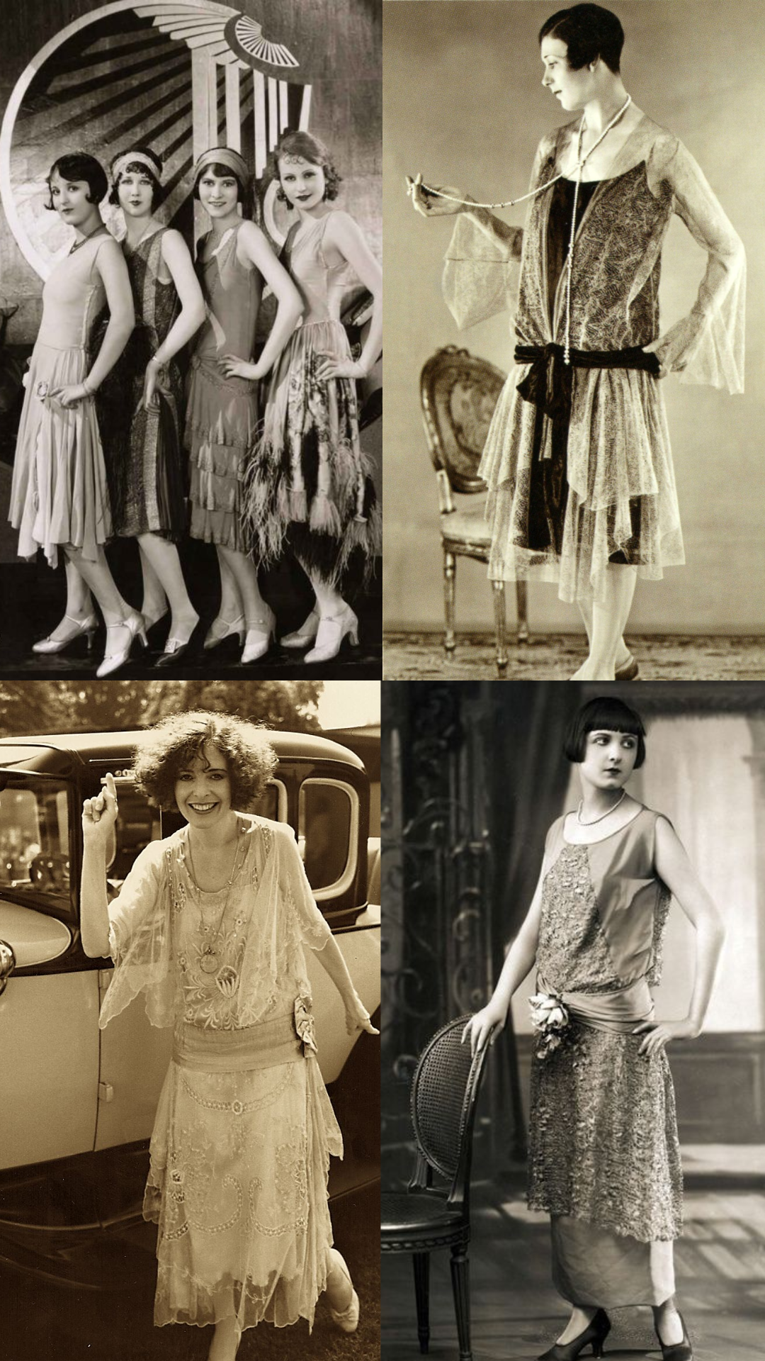 La silueta flapper fue una ruptura absoluta con todo lo anterior: la cintura desapareció, el largo de la falda subió hasta la rodilla (escandaloso en su momento), el corsé fue abandonado y la ropa interior se simplificó radicalmente. El ideal de belleza se masculinizó — senos planos, caderas angostas, cuello largo — y el pelo corto en bob o shingle cut se convirtió en símbolo de emancipación. Las telas eran ligeras: gasa, seda, chiffon, y el tejido de punto que Coco Chanel popularizó.
