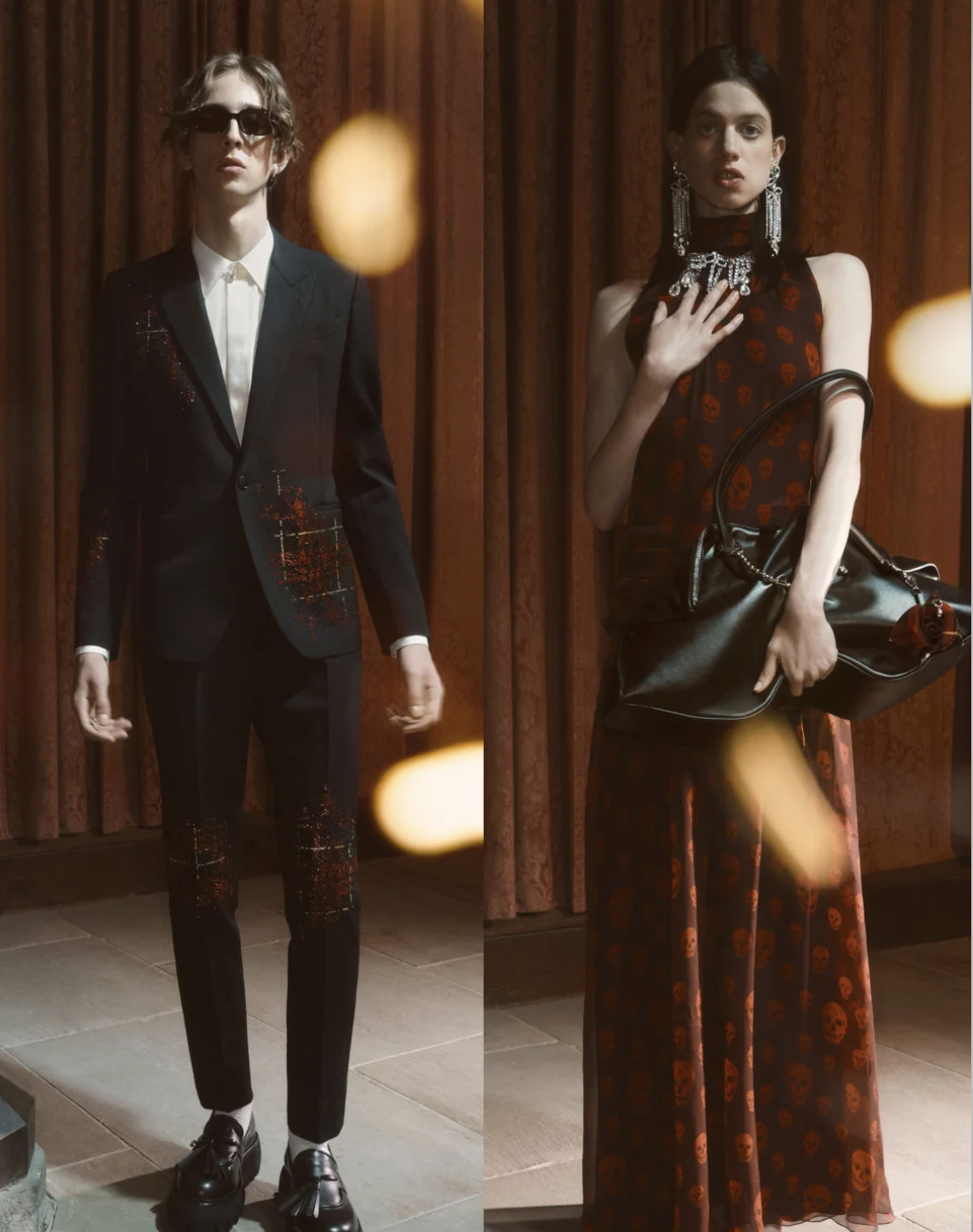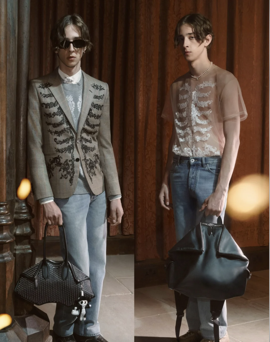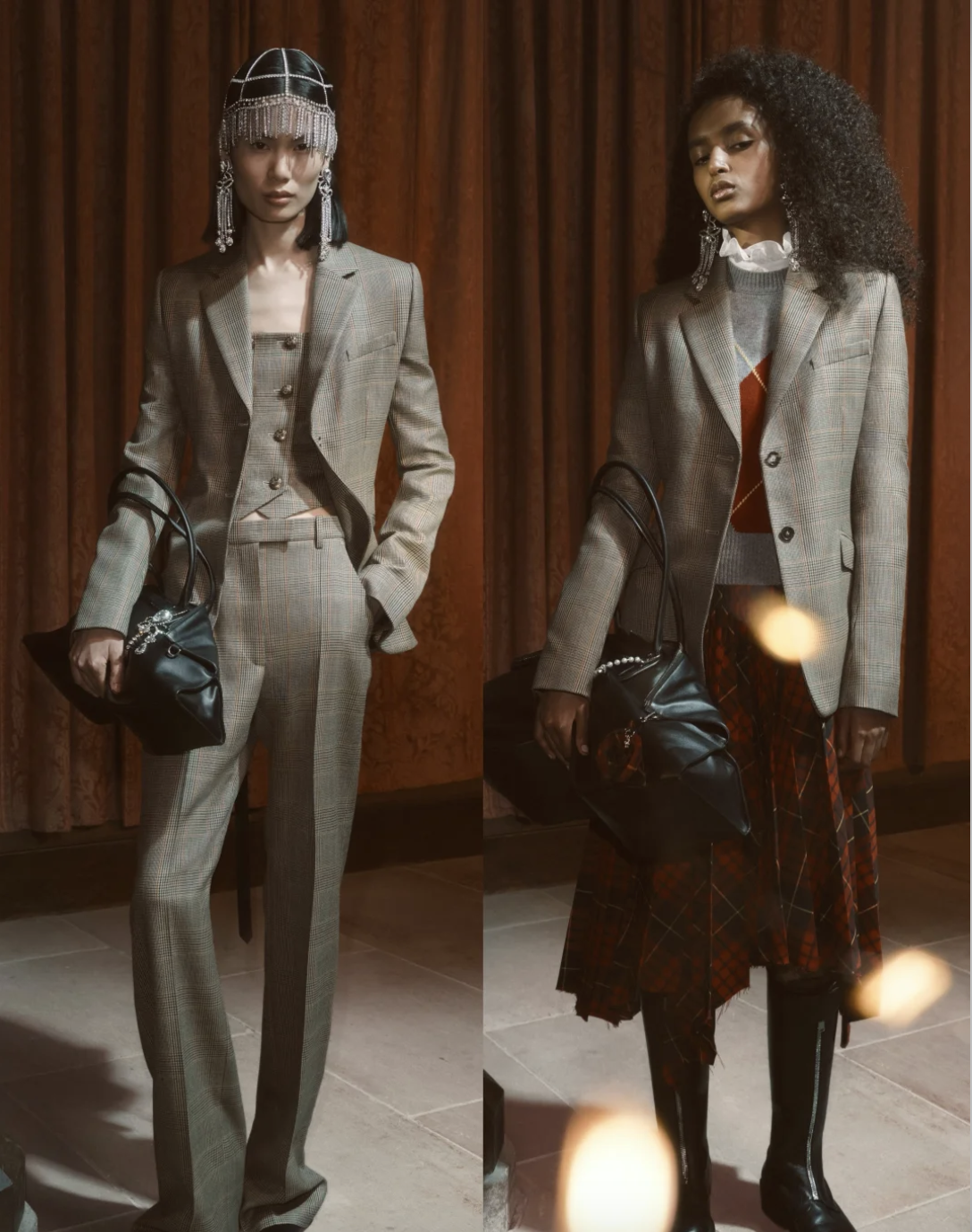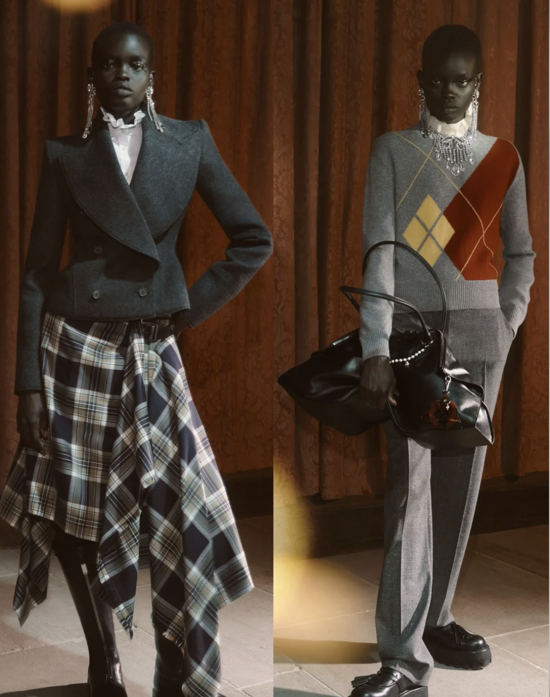 La colección trabaja con una tensión clásica del vestuario inglés: el contraste entre la pulcritud académica y la noche indisciplinada. Sweaters argyle, blazers impecables y camisas blancas conviven con faldas desplazadas, plataformas contundentes y bolsos de cuero blando que parecen moldeados por el paso del tiempo. La estética resultante —mitad “estudiante modelo”, mitad “habitante del underground”— funciona como una narrativa visual que dialoga con la tradición británica sin caer en el homenaje directo. McQueen toma ese choque cultural y lo lleva hacia una lectura más contenida, más urbana y definitivamente más contemporánea.